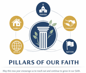 As we welcome this new year, we introduce our 2026 Parish Theme – Pillars of Our Faith. Our Advent/Christmas parish gift book of The Seven Pillars of Catholic Spirituality will start us off with a book review/discussion in February. We will then continue throughout the year with various learning opportunities, life-long faith formation efforts and offering various ways to act on the various “pillars of our faith”.